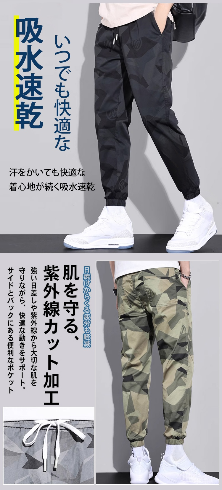 迷彩速乾接触冷感ジョガーパンツ【男女兼用】、Coolmax冷却テクノロジーで、体感温度3℃ダウン!3秒で速乾
